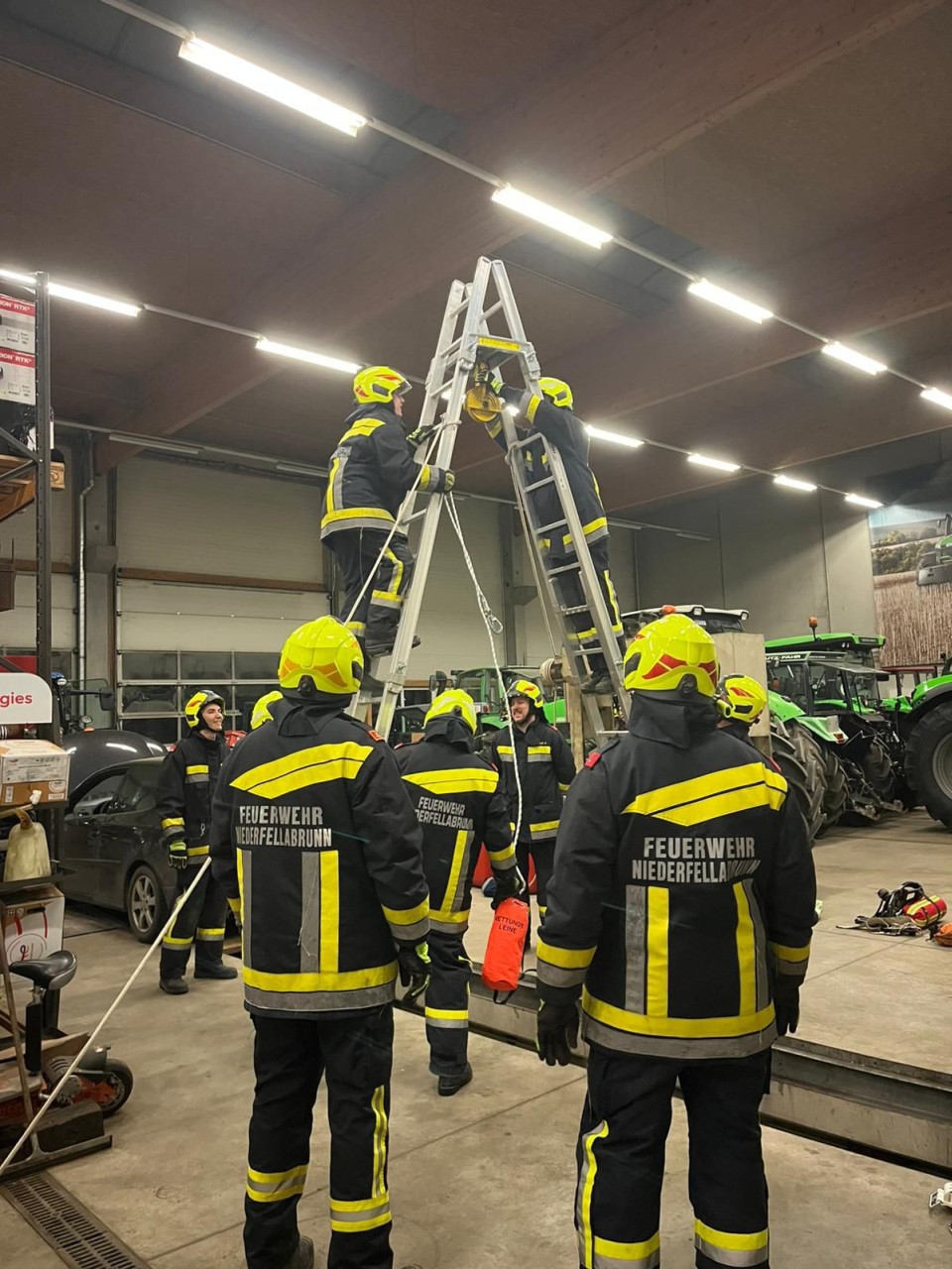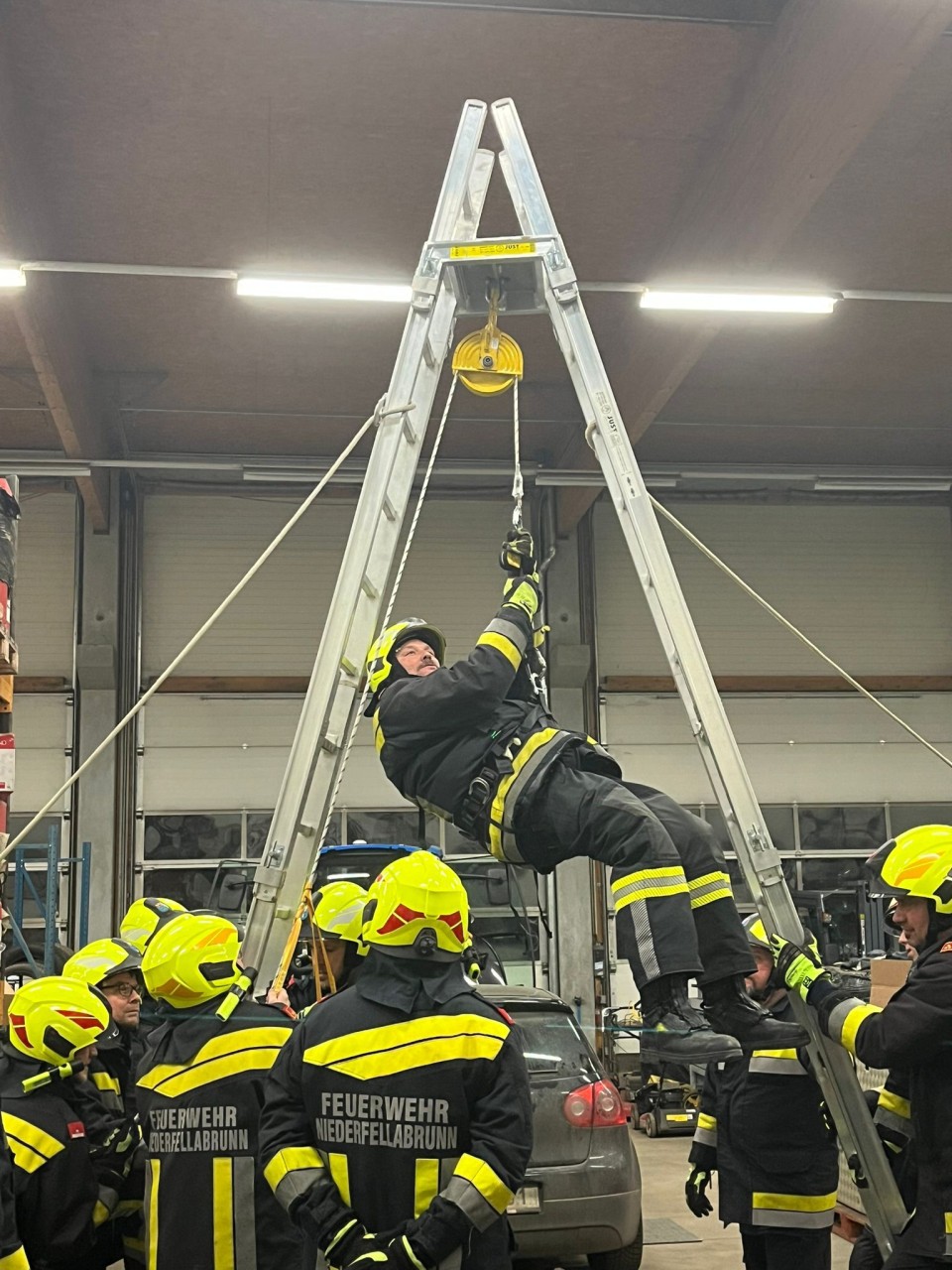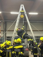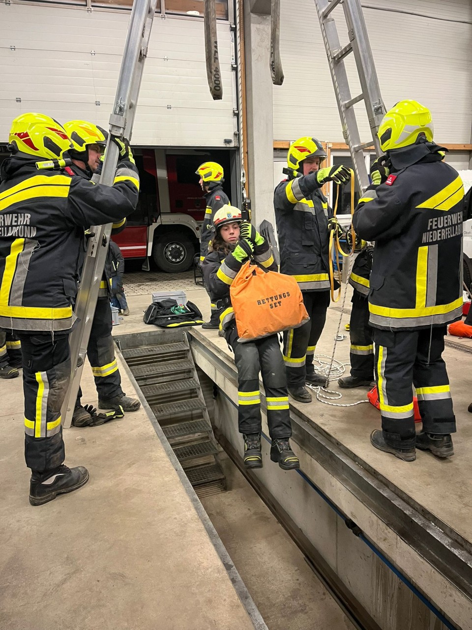 Mithilfe von Steckleiter, Klettergurt, Notrettungsset usw. wurde in mehreren Durchgängen die Menschenrettung aus einer Montiergrube geübt.