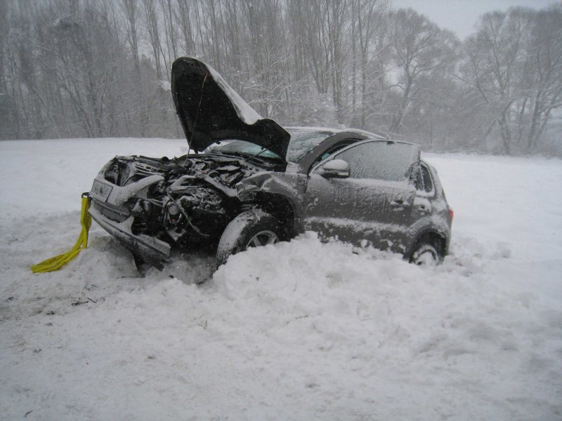 Ein PKW war auf der schneeglatten Fahrbahn ins Schleudern und seitwärts im Graben zum