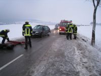 Ca. 1 km vor der Kreuzung nach Haselbach war ein PKW bei Schneeverwehungen und starkem Wind ins Schleudern