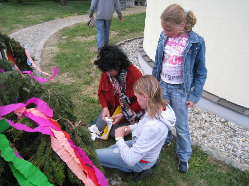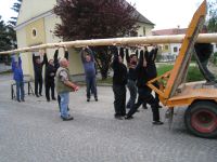 Aufgrund des starken Windes wurde heuer auf dei traditionelle Art des Maibaumaufstellen mittels Stangen verzichtet - der Traktor
